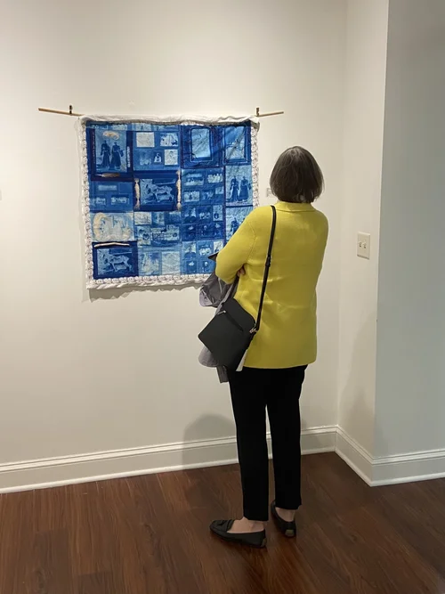 Cyanotype solution painted on muslin. Vest is made from cyanotypes of the paintings Portrait of Young Woman with Unicorn by Raphael, Virgin and Unicorn by Domenichino, Lady with a Unicorn by Luca Longhi, and the tapestry The Unicorn Rests in a Garden. The pattern is one my Mom used to make a medieval maid costume for me as a child, which I wore into adulthood. Unicorn is made from cotton stuffed with kapok fiber, sumi ink dyed hooves, with felted milk fiber mane and tale.